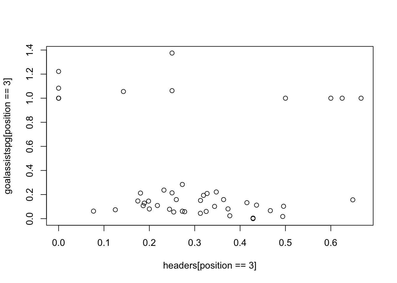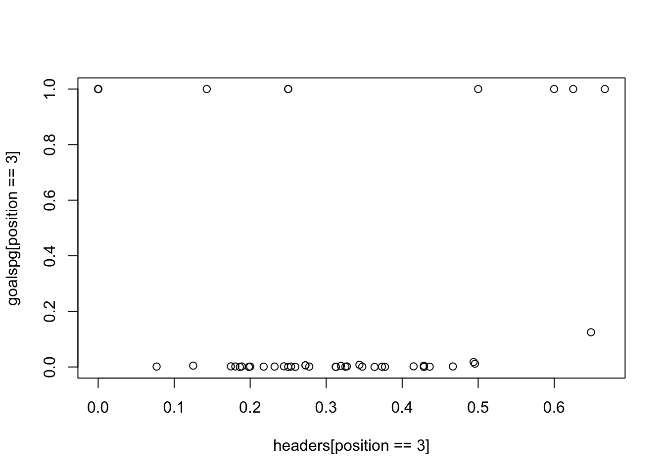plot(goalassistspg [position ==3] ~ headers [position ==3])