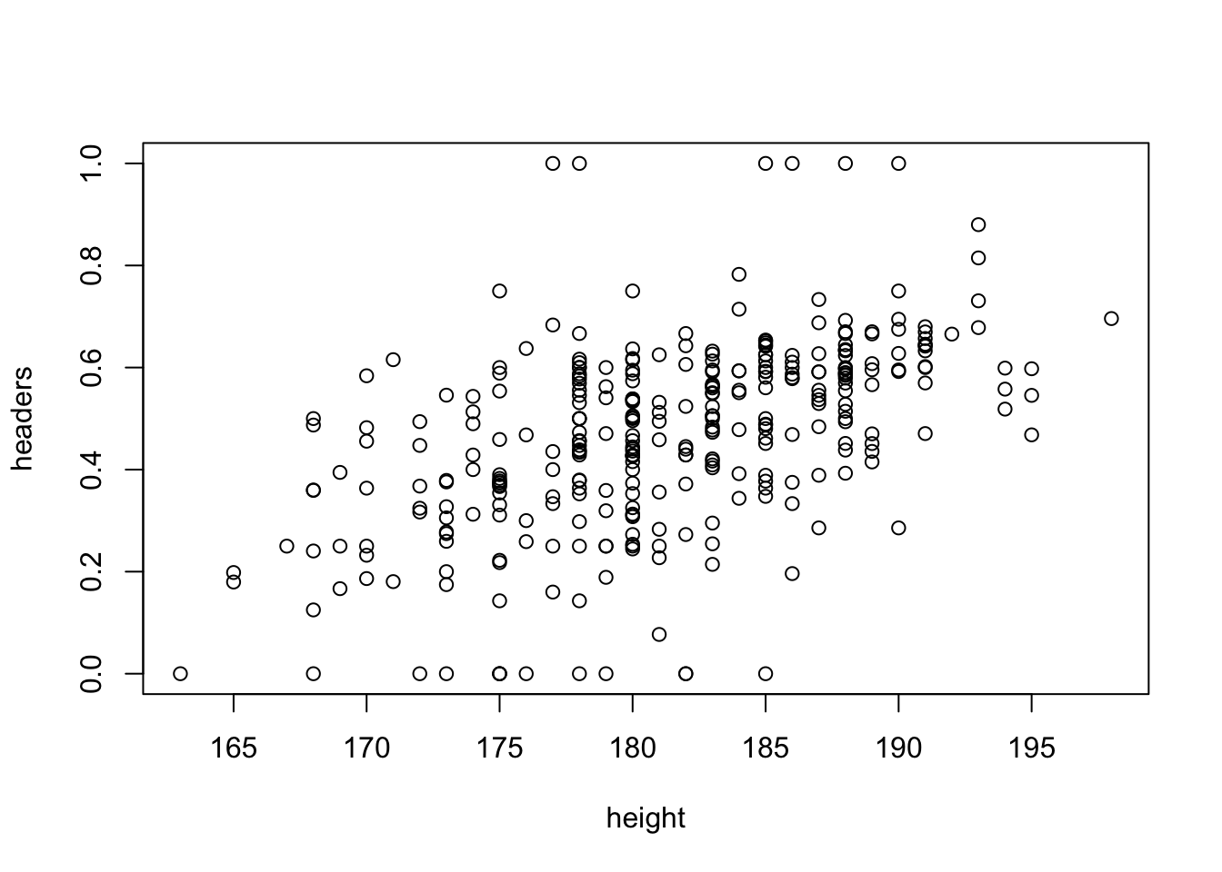 Upon a deeper analysis of this relationship, we can see that there are significant evidence that height and headers are indeed correlated, at a significance level close to 0, with a correlation of 0.015. That means that for 1 cm of height, the associated increase % of headers won is about 1.5%.